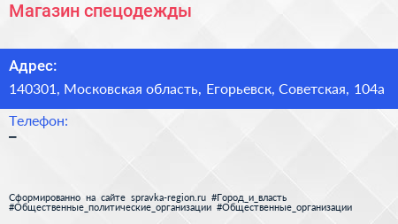 Магазин спецодежды по адресу 140301, Московская область, Егорьевск, Советская, 104а в дальнейшем Организация, размещена в следующих категориях: