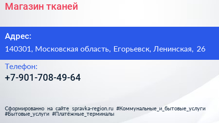 Магазин тканей по адресу 140301, Московская область, Егорьевск, Ленинская, 26 в дальнейшем Организация, размещена в следующих категориях: