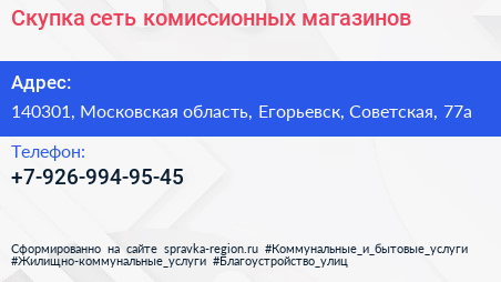 Скупка, сеть комиссионных магазинов по адресу 140301, Московская область, Егорьевск, Советская, 77а в дальнейшем Организация, размещена в следующих категориях: