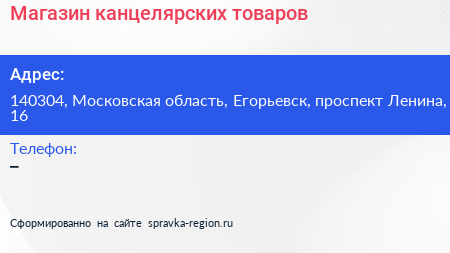 Магазин канцелярских товаров по адресу 140304, Московская область, Егорьевск, проспект Ленина, 16 в дальнейшем Организация, размещена в следующих категориях: