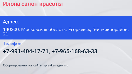 Илона, салон красоты по адресу 140300, Московская область, Егорьевск, 5-й микрорайон, 21 в дальнейшем Организация, размещена в следующих категориях: