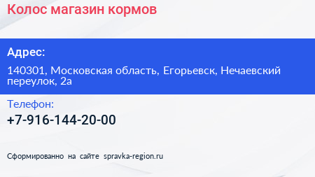 Колос, магазин кормов по адресу 140301, Московская область, Егорьевск, Нечаевский переулок, 2а в дальнейшем Организация, размещена в следующих категориях: