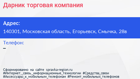 Дарник, торговая компания по адресу 140301, Московская область, Егорьевск, Смычка, 28в в дальнейшем Организация, размещена в следующих категориях: