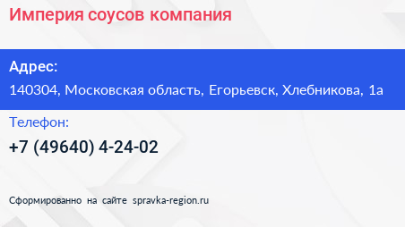 Империя соусов, компания по адресу 140304, Московская область, Егорьевск, Хлебникова, 1а в дальнейшем Организация, размещена в следующих категориях: