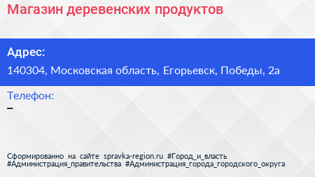 Магазин деревенских продуктов по адресу 140304, Московская область, Егорьевск, Победы, 2а в дальнейшем Организация, размещена в следующих категориях: