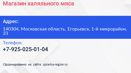 Магазин халяльного мяса по адресу 140304, Московская область, Егорьевск, 1-й микрорайон, 23 в дальнейшем Организация, размещена в следующих категориях: