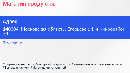 Магазин продуктов по адресу 140304, Московская область, Егорьевск, 1-й микрорайон, 74 в дальнейшем Организация, размещена в следующих категориях: