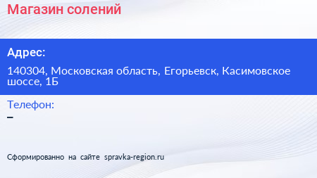 Магазин солений по адресу 140304, Московская область, Егорьевск, Касимовское шоссе, 1Б в дальнейшем Организация, размещена в следующих категориях: