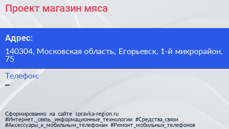 Проект, магазин мяса по адресу 140304, Московская область, Егорьевск, 1-й микрорайон, 75 в дальнейшем Организация, размещена в следующих категориях: