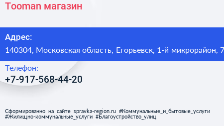 Tooman, магазин по адресу 140304, Московская область, Егорьевск, 1-й микрорайон, 7 в дальнейшем Организация, размещена в следующих категориях: