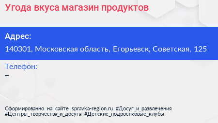 Угода вкуса, магазин продуктов по адресу 140301, Московская область, Егорьевск, Советская, 125 в дальнейшем Организация, размещена в следующих категориях: