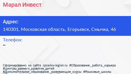 Марал-Инвест по адресу 140301, Московская область, Егорьевск, Смычка, 46 в дальнейшем Организация, размещена в следующих категориях: