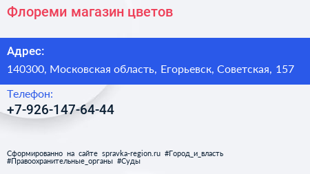 Флореми, магазин цветов по адресу 140300, Московская область, Егорьевск, Советская, 157 в дальнейшем Организация, размещена в следующих категориях: