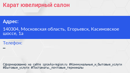 Карат, ювелирный салон по адресу 140304, Московская область, Егорьевск, Касимовское шоссе, 1а в дальнейшем Организация, размещена в следующих категориях: