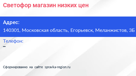 Светофор, магазин низких цен по адресу 140301, Московская область, Егорьевск, Меланжистов, 3Б в дальнейшем Организация, размещена в следующих категориях: