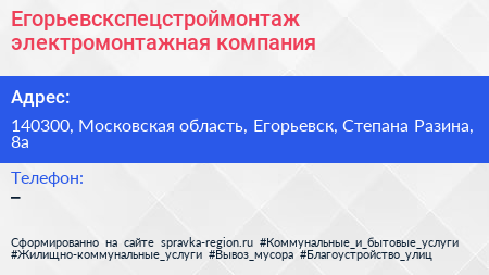 Егорьевскспецстроймонтаж, электромонтажная компания по адресу 140300, Московская область, Егорьевск, Степана Разина, 8а в дальнейшем Организация, размещена в следующих категориях: