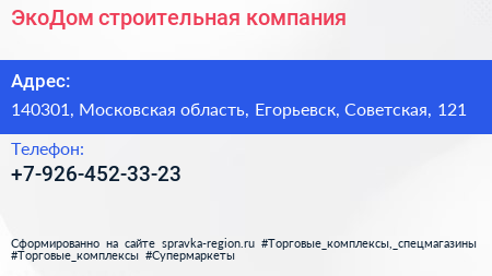 ЭкоДом, строительная компания по адресу 140301, Московская область, Егорьевск, Советская, 121 в дальнейшем Организация, размещена в следующих категориях: