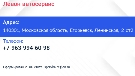 Левон, автосервис по адресу 140301, Московская область, Егорьевск, Ленинская, 2 ст2 в дальнейшем Организация, размещена в следующих категориях: