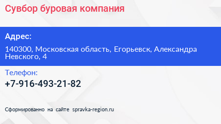 Сувбор, буровая компания по адресу 140300, Московская область, Егорьевск, Александра Невского, 4 в дальнейшем Организация, размещена в следующих категориях: