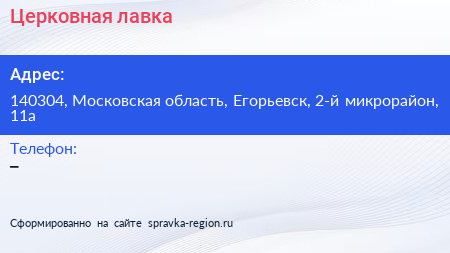 Церковная лавка по адресу 140304, Московская область, Егорьевск, 2-й микрорайон, 11а в дальнейшем Организация, размещена в следующих категориях: