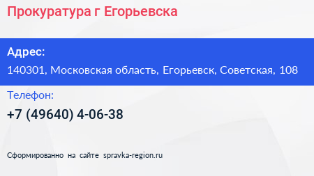 Прокуратура г. Егорьевска по адресу 140301, Московская область, Егорьевск, Советская, 108 в дальнейшем Организация, размещена в следующих категориях: