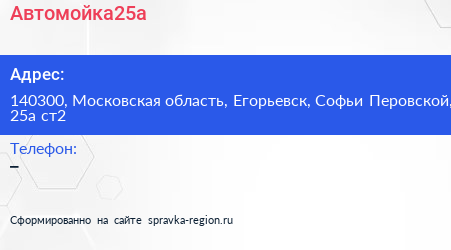 Автомойка25а по адресу 140300, Московская область, Егорьевск, Софьи Перовской, 25а ст2 в дальнейшем Организация, размещена в следующих категориях: