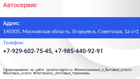Автосервис по адресу 140305, Московская область, Егорьевск, Советская, 1а ст1 в дальнейшем Организация, размещена в следующих категориях: