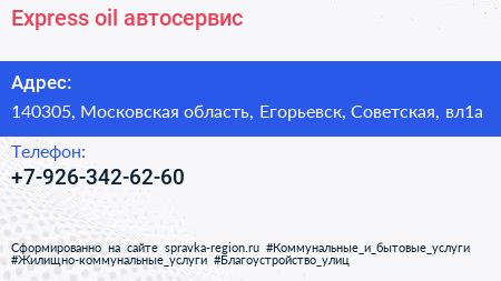 Express oil, автосервис по адресу 140305, Московская область, Егорьевск, Советская, вл1а в дальнейшем Организация, размещена в следующих категориях: