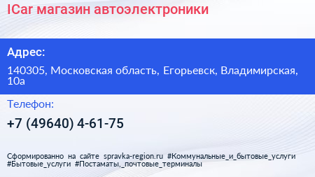 ICar, магазин автоэлектроники по адресу 140305, Московская область, Егорьевск, Владимирская, 10а в дальнейшем Организация, размещена в следующих категориях: