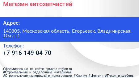 Магазин автозапчастей по адресу 140305, Московская область, Егорьевск, Владимирская, 10а ст1 в дальнейшем Организация, размещена в следующих категориях: