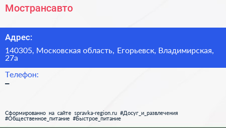 Мострансавто по адресу 140305, Московская область, Егорьевск, Владимирская, 27а в дальнейшем Организация, размещена в следующих категориях: