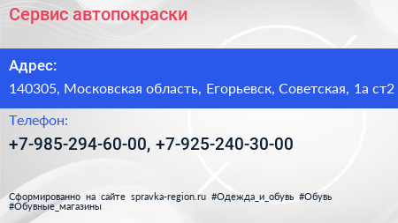 Сервис автопокраски по адресу 140305, Московская область, Егорьевск, Советская, 1а ст2 в дальнейшем Организация, размещена в следующих категориях: