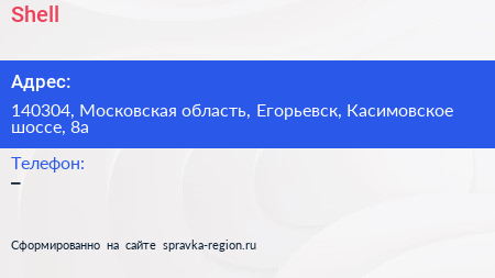 Shell по адресу 140304, Московская область, Егорьевск, Касимовское шоссе, 8а в дальнейшем Организация, размещена в следующих категориях: