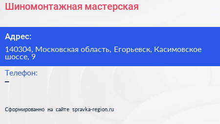Шиномонтажная мастерская по адресу 140304, Московская область, Егорьевск, Касимовское шоссе, 9 в дальнейшем Организация, размещена в следующих категориях: