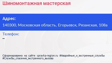 Шиномонтажная мастерская по адресу 140300, Московская область, Егорьевск, Рязанская, 108а в дальнейшем Организация, размещена в следующих категориях: