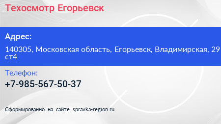 Техосмотр-Егорьевск по адресу 140305, Московская область, Егорьевск, Владимирская, 29 ст4 в дальнейшем Организация, размещена в следующих категориях: