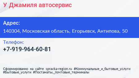 У Джамиля, автосервис по адресу 140304, Московская область, Егорьевск, Антипова, 50 в дальнейшем Организация, размещена в следующих категориях: