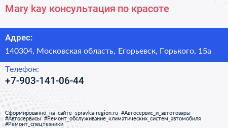 Mary kay, консультация по красоте по адресу 140304, Московская область, Егорьевск, Горького, 15а в дальнейшем Организация, размещена в следующих категориях:
