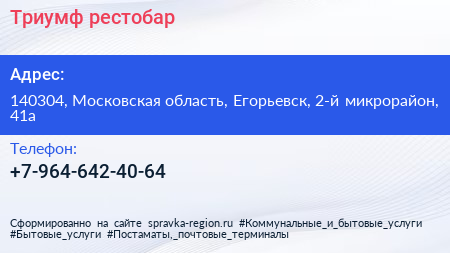Триумф, рестобар по адресу 140304, Московская область, Егорьевск, 2-й микрорайон, 41а в дальнейшем Организация, размещена в следующих категориях: