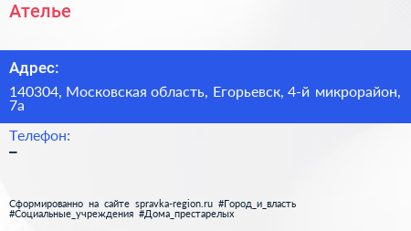 Ателье по адресу 140304, Московская область, Егорьевск, 4-й микрорайон, 7а в дальнейшем Организация, размещена в следующих категориях: