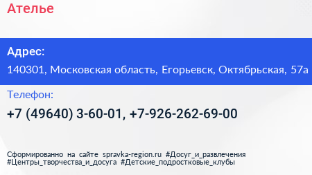 Ателье по адресу 140301, Московская область, Егорьевск, Октябрьская, 57а в дальнейшем Организация, размещена в следующих категориях: