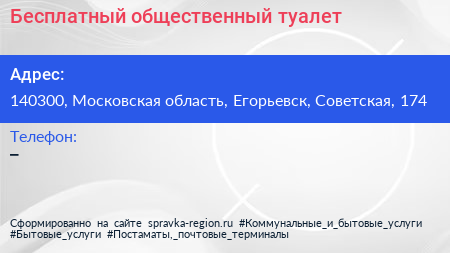 Бесплатный общественный туалет по адресу 140300, Московская область, Егорьевск, Советская, 174 в дальнейшем Организация, размещена в следующих категориях: