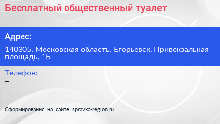 Бесплатный общественный туалет по адресу 140305, Московская область, Егорьевск, Привокзальная площадь, 1Б в дальнейшем Организация, размещена в следующих категориях: