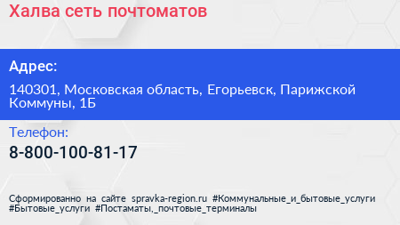 Халва, сеть почтоматов по адресу 140301, Московская область, Егорьевск, Парижской Коммуны, 1Б в дальнейшем Организация, размещена в следующих категориях:
