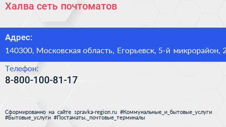 Халва, сеть почтоматов по адресу 140300, Московская область, Егорьевск, 5-й микрорайон, 2 в дальнейшем Организация, размещена в следующих категориях: