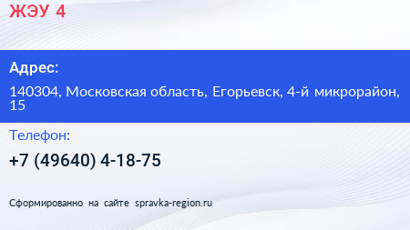 ЖЭУ №4 по адресу 140304, Московская область, Егорьевск, 4-й микрорайон, 15 в дальнейшем Организация, размещена в следующих категориях: