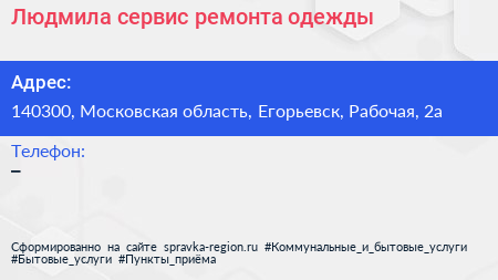Людмила, сервис ремонта одежды по адресу 140300, Московская область, Егорьевск, Рабочая, 2а в дальнейшем Организация, размещена в следующих категориях: