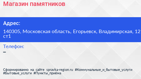 Магазин памятников по адресу 140305, Московская область, Егорьевск, Владимирская, 12 ст1 в дальнейшем Организация, размещена в следующих категориях:
