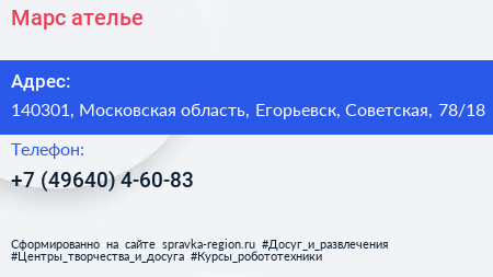 Марс, ателье по адресу 140301, Московская область, Егорьевск, Советская, 78/18 в дальнейшем Организация, размещена в следующих категориях: