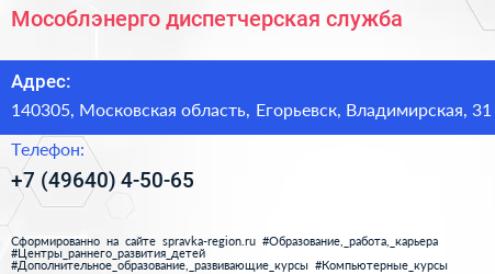 Мособлэнерго, диспетчерская служба по адресу 140305, Московская область, Егорьевск, Владимирская, 31 в дальнейшем Организация, размещена в следующих категориях: